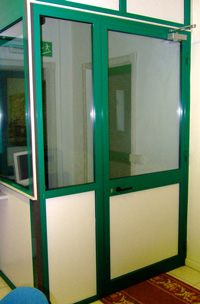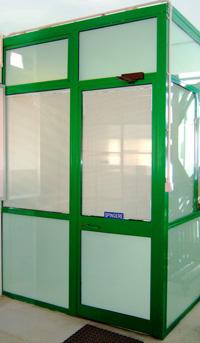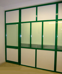 In figura viene raffigurato un angolo di una parete mobile con porta d' ingresso a spingere verso l'interno, in questo caso l'utilizzo di questo locale non è di un ufficio ma di spogliatoio, per qiesto motivo solo la porta ha il vetro mentre il resto della struttura e realizzato con pannelli.