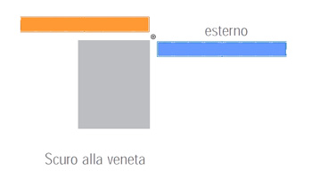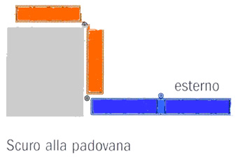 Lo scuro alla padovana si compone di due pannelli distinti, di solito di diverse dimensioni, uniti da bandelle con snodo centrale.