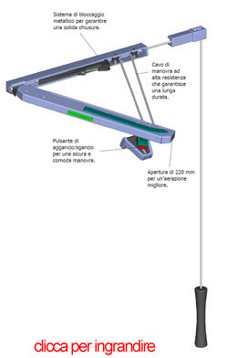 La chiusura del vasistas con il braccio newton, consente l'apertura dello stesso anche quando il vasistas e posto molto in alto ed è impossibile raggiungerlo manualmente, grazie alla cordicella del nostro braccio newton possiamo manovrarlo agilmente, soltanto tirando la stessa.