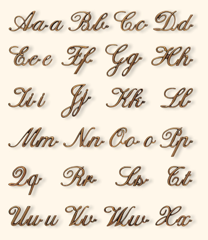 Le lettere iniziali minuscole, sono completate da una gambetta. Le lettere terminali sono predisposte senza gancio.
