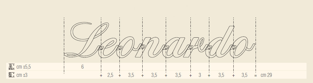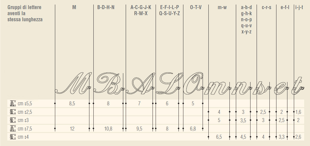 Prima di scegliere l'altezza del carattere Corsivo Istant, accertatevi dello spazio (in lunghezza) di cui disponete! Consultate il sistema di calcolo, qui sotto riportato. |